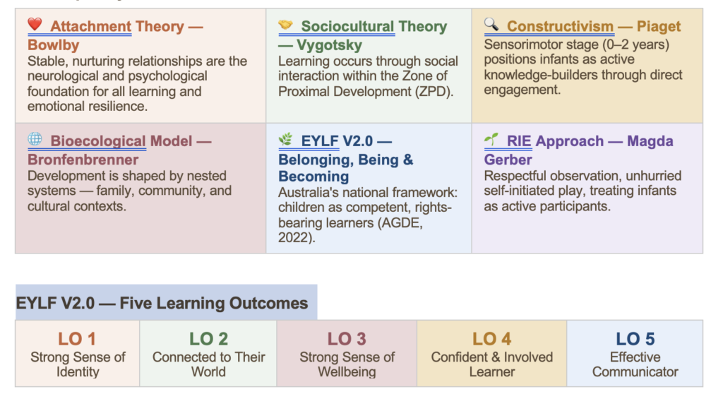 Children at this stage learn through sensory exploration, movement, communication, and safe interactions with familiar adults (Kearns, 2020). Contemporary practice integrates attachment theory, sociocultural models, and bioecological systems theory to view learning as a co-constructed process occurring within secure, culturally situated relationships (Arthur et al., 2024; Garvis et al., 2019). Piaget’s sensorimotor stage further positions children as active constructors of knowledge through direct environmental engagement. Critically, intentional instruction in language structures — phonology, syntax, and semantics — is essential given identified gaps in ECT oral language preparedness (Weadman et al., 2021).